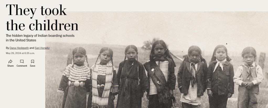 They took the children, The hidden legacy of Indian boarding schools in the United States by Dana Hedgpeth and Sari Horwitz, The Washington Post, May 29, 2024